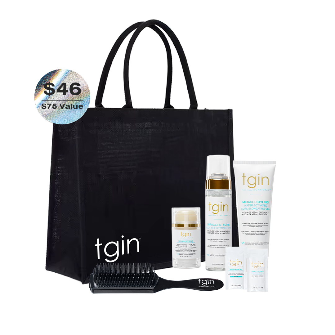 · FREE: Miracle Styling Water Activated Curl Elongating Gel Packette, Miracle Styling Ayurvedic Hair & Scalp Oil Packette, Define + Style Brush, & Premium tgin® Burlap Bag