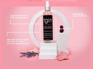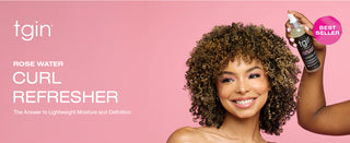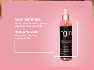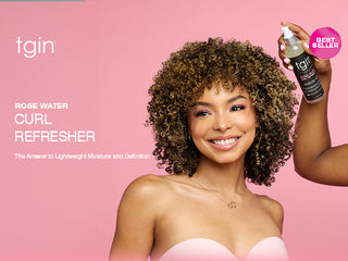 tgin Rose Water Curl Refresher is the perfect pick me up for even the most dull, lifeless curls. Our special formula is enriched with rose water and coconut oil to hydrate, smooth and refresh overworked kinks, curls, and waves.