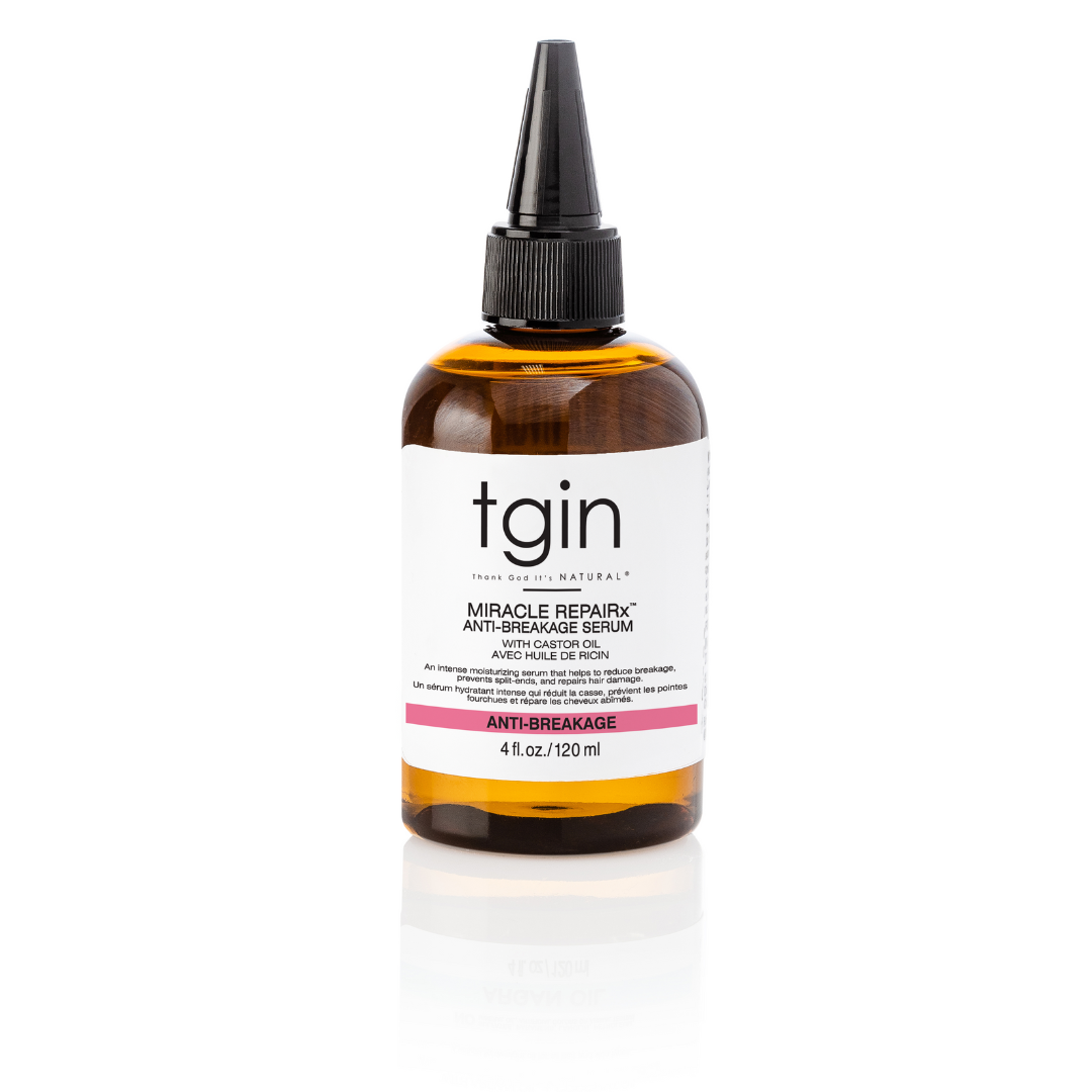 Packed with rejuvenating castor, coconut, olive, argan, jojoba, and peach kernel oils, the nutrient-rich tgin Miracle RepaiRx Anti-Breakage Serum smooths frizz and flyaways, adds hydration and leaves hair feeling soft and strong with vitamin E.