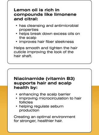 The Balance Collection harnesses the power of skincare-inspired ingredients to treat your scalp with the same care you give your skin. We chose Niacinamide (Vitamin B3) for its exceptional ability to help regulate oil production.