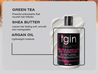 Kiss dry hair goodbye and say hello to soft, beautiful moisturized curls with tgin Green Tea Super Moist Leave in Conditioner. Packed with green tea, shea butter, and argan oil, this lightweight formula has the perfect combination of moisture and antioxidants, which helps to improve manageability, fight frizz, and transform dry brittle strands into soft, smooth and healthy hair. This natural conditioner is also great for detangling and safe enough for kids!